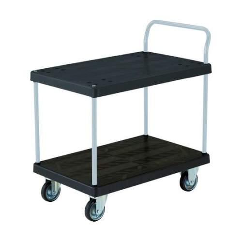表面抵抗値約10^5Ωで、大型精密機器の移動の際、大変便利です。2段の天板に、別々の精密部品を載せ工場ライン脇を搬送できます。