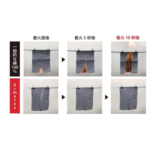 高い自己消火性▼Armatex製品に使われる生地は綿100%に防炎加工を施した素材やモダクリルなどの難燃素材を混紡した防炎生地です。▼一般的なコットンは燃えやすい素材ですが、Armatex防炎製品は高
