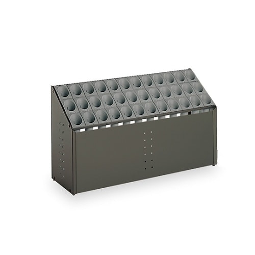 筒状のシュートに傘を1本1本収納するので、出し入れがスムーズにできます。物をのせたり座ったりできない斜め天板。傘立内部を見せない前面パネル付。 |