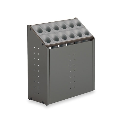 筒状のシュートに傘を1本1本収納するので、出し入れがスムーズにできます。物をのせたり座ったりできない斜め天板。傘立内部を見せない前面パネル付。 |