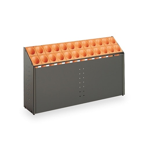 筒状のシュートに傘を1本1本収納するので、出し入れがスムーズにできます。物をのせたり座ったりできない斜め天板。傘立内部を見せない前面パネル付。