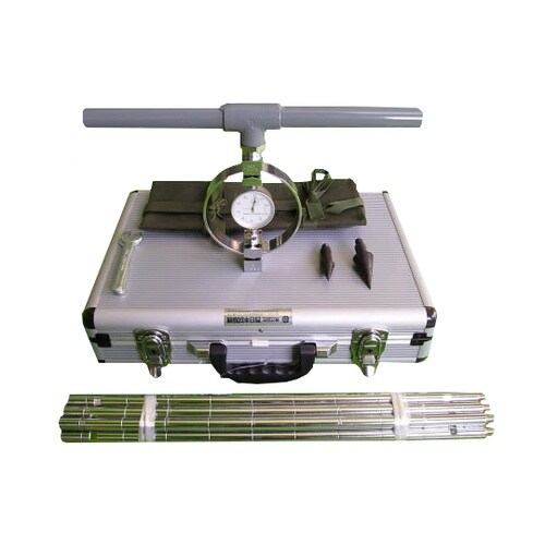 コーンペネトロメーターは最も操作が簡易で携帯型の静的円錘貫入試験器で、先端コーンを人力によって静的に土中へ押し込む時に要する貫入抵抗をプルービングリングで測定して粘性土の相対的強度、粘着力、一軸圧縮強 |