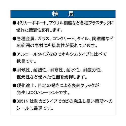 強靱で耐疲労性に優れたアルコールタイプのシリコンシーラントです。アクリル・ポリカーボネートに加え、フッ素鋼板・ガルバリウム鋼板にもノンプライマーで施工できます。MEKOを発生しないのでツンとしたにおい |