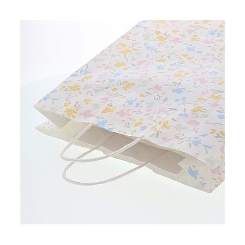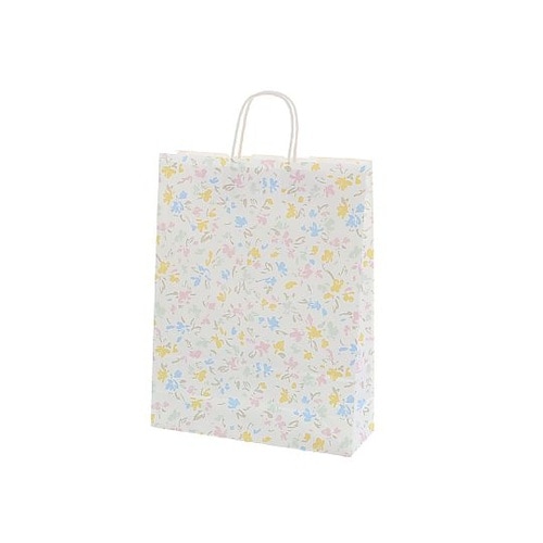 白地にカラフルなお花を散りばめた、シンプルで上品な手提げ袋です。縦長のスタンダードサイズ。手紐:丸紐白 |