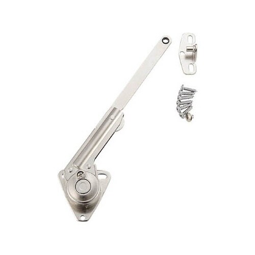 ラプコン機構を搭載した上蓋用のソフトダウンステーです。扉が最大に開いた状態を保持するキャッチを組み込んでいます。取付位置により、全開時の角度が70°、105°になります。調整ねじで、扉の開閉速度は調整 |