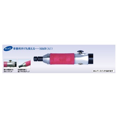 静音ロータリーエアーモーターを採用。ボタンスイッチで連続使用が楽にできます。アルミボディーによる軽量化。付属のスリーブコレットを使用することにより、3mmもキャッチング可能。先端径が細く作業性が向上。 |
