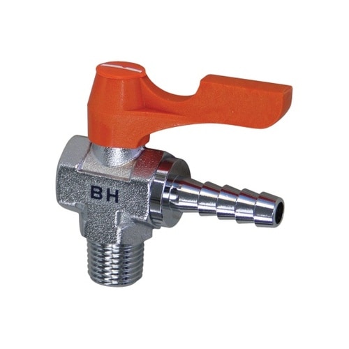 親切設計の小型ボールバルブです。ホースニップル一体型となります。ハンドルの開閉位置を変更する事も可能です。90度配管に適しています。 |
