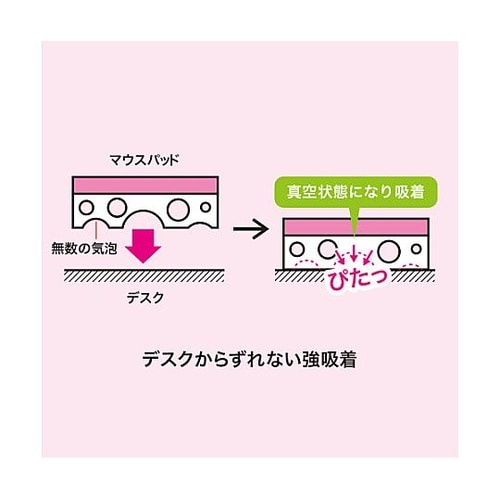 デスクからずれない高吸着マウスパッドです。裏面のPVC(ポリ塩化ビニル)発泡フォーム内の無数の気泡ひとつひとつが吸盤の役割を果たすため、指で押してもずれないほど強力にデスクに貼り付きます。 |