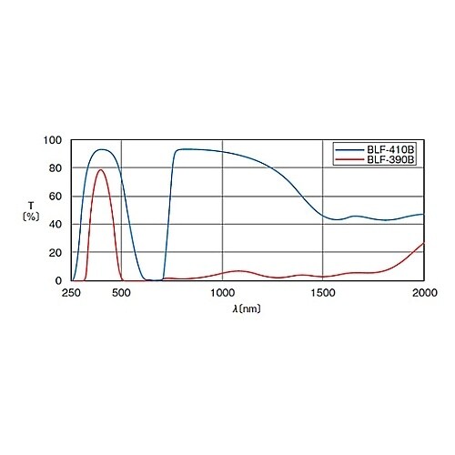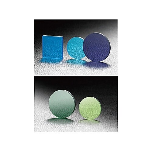 青から緑の波長域で特定の波長を透過させ、可視光の他の波長域がカットされているフィルターです。白色光から青または緑の光を取り出す場合や複数の発光波長から特定波長の発光だけを取り出すのに使われます。 |