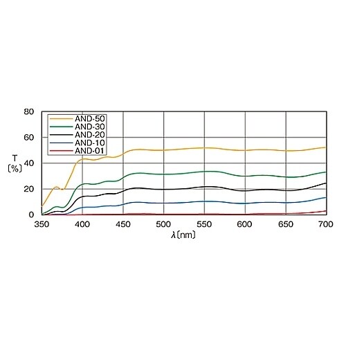 可視光を減光するための丸型のフィルターです。吸収タイプなので、反射による迷光が小さく、しかも、減光によって透過光の波長特性が大きく変わることはありません。