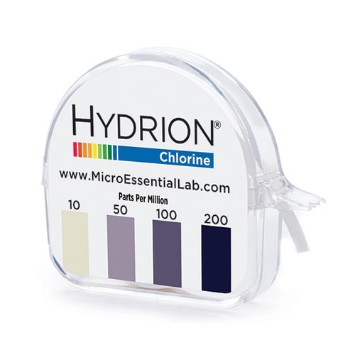 塩素が使われている消毒液の塩素濃度の測定用です。試験紙をサンプルの液体に漬け、すぐに取り出してカラーチャートと比較してppm値を読み取ります。 |