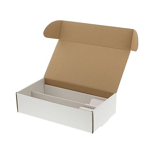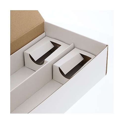 表面が白い段ボール材質の無地箱です。フルボトルのワイン2本用で、ボトルを安定させる台紙が付いています。 |