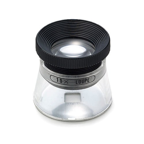 15倍の高倍率ルーペ。アルミプレートに0.1mm刻みのスケールが印刷されており、印刷物の検査、細かい平面物の測量に便利です。 |