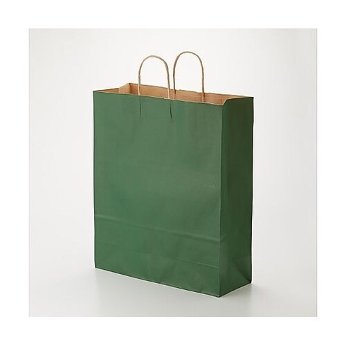 クラフト紙に緑ベタを印刷した手提げ紙袋です。色落ちを緩和させるために、上からニスを塗布しています。 |
