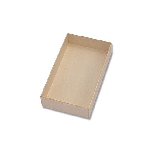 ファルカタ材という早生樹を使用した食品箱です。CO2等の温室効果ガス削減の考えを元に出来た商品です。食品を直接入れられるように、木を薄い板状にしてから両面にグラシンを貼っています。 |