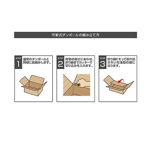 初めから4段階の折筋が付けてあるダンボールです。内容物に合わせて高さを調節する際に便利で、作業時間を短縮し、仕上がりもキレイです。 |