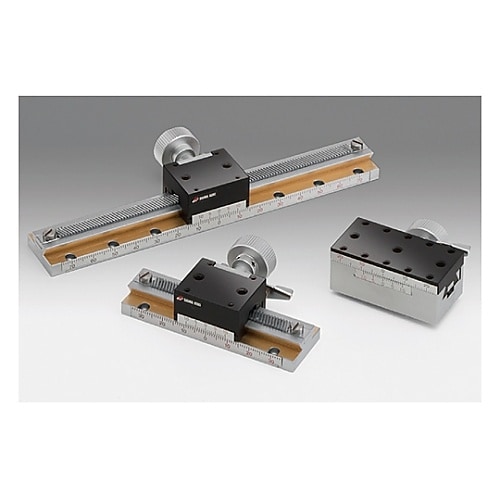 アリ溝ガイド・ラックピニオン方式により、動作頻度が比較的多く、早い動きと移動量が必要な場合に適したステージです。テーブル面サイズは25×30mmのロングストロークタイプのアリ式ステージです。 |
