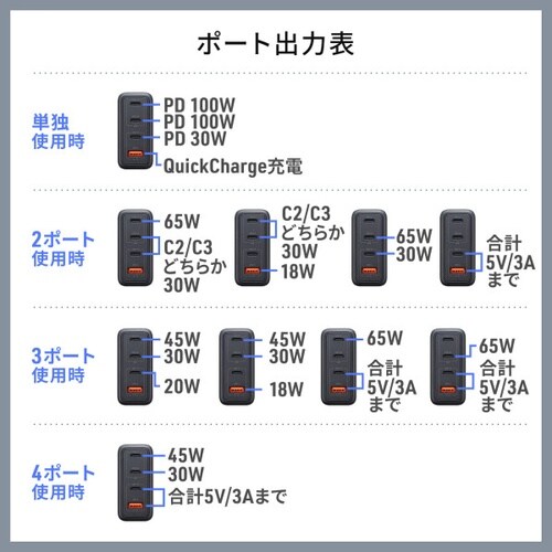 USBPowerDelivery規格の最大100W出力に対応し、USB−Cを3ポート、USB−Aを1ポート搭載したマルチポート仕様のAC充電器。 |