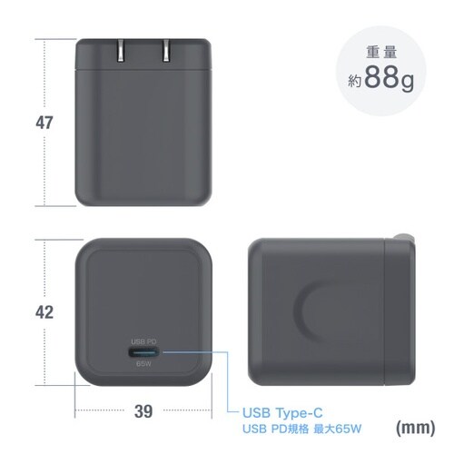 スマートフォンからノートパソコンまで1台で幅広い機器の充電に対応した、USBPD規格65W出力のキューブ型AC充電器。 |