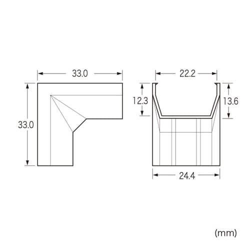 ケーブルカバー(角型)の接続部品。幅22mm、入角(イリズミ)タイプ、ブラック |