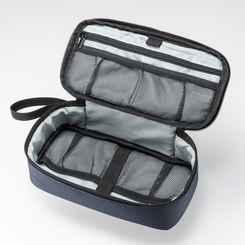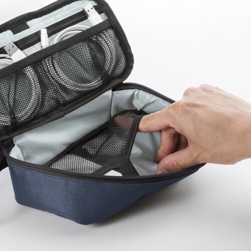 モバイルバッテリーやアダプタなどの小物をまとめてすっきり整理収納できるコンパクトポーチ。幅215×奥行115×高さ65mm。ネイビー。 |