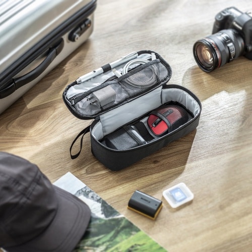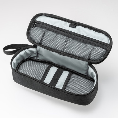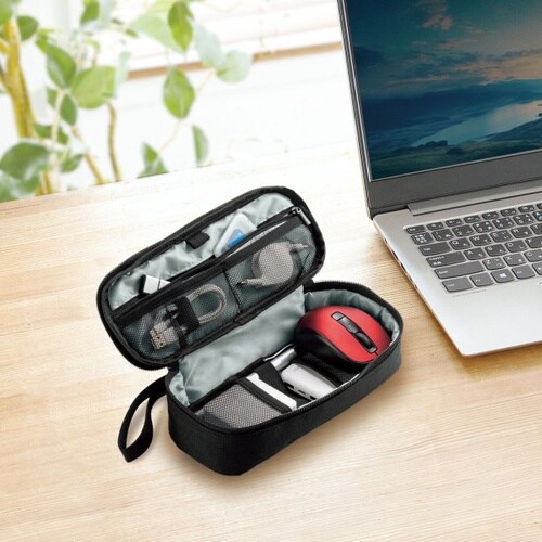モバイルバッテリーやアダプタなどの小物をまとめてすっきり整理収納できるコンパクトポーチ。幅245×奥行100×高さ65mm。ブラック。 |