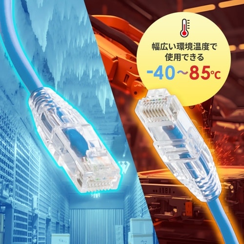 伝送速度1Gbps、伝送帯域250MHzを実現したカテゴリ6LANケーブル。対応温度範囲−40ー85℃、やわらか素材とケーブル径4.1mmのスリム仕様。ツメ折れ防止構造の「への字ラッチ」コネクタ採用。 |
