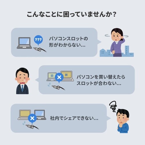 3種のセキュリティスロットに対応。シリンダ錠タイプのセキュリティワイヤー。簡易パッケージ仕様。鍵No.1。 |