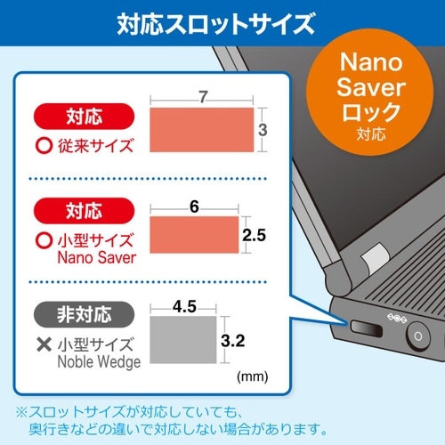 標準、nanoの2種のセキュリティスロットに対応。シリンダ錠タイプのセキュリティワイヤー。簡易パッケージ仕様。鍵No.1。 |