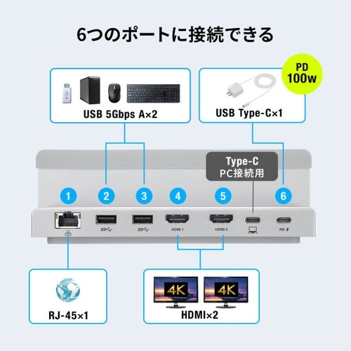 最大2台のディスプレイへの映像出力できるクラムシェルスタンド一体型ドッキングステーション。 |