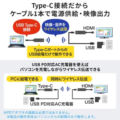 Type−Cポートから映像・音声信号をワイヤレスで送信し、HDMI出力で大型テレビなどに4K/60Hz解像度にアップスケーリングして表示できる。 |