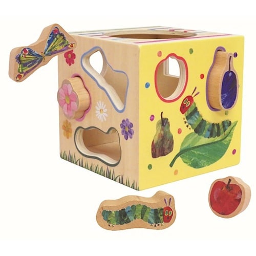 「はらぺこあおむし」がかたちあわせキューブになって登場!いろんな色や形のブロックが9ピースセットされています。4つの側面にはにぎやかなイラストが描かれており、木の温もりを感じながら楽しく遊べます。 |