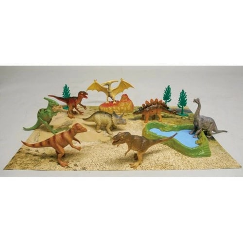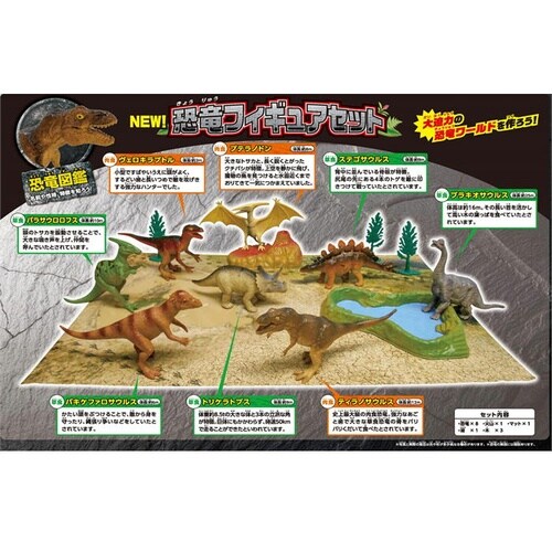 恐竜8個、火山1個、湖1個、木3個のフィギュアがついたフィギュアセットです。恐竜は全部で8種類。大迫力の恐竜ワールドをつくってあそぼう! |