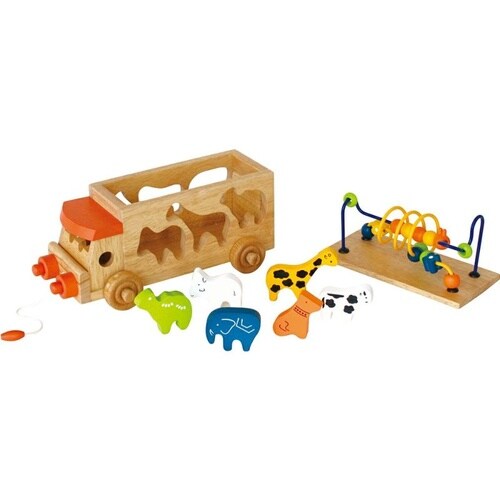 動物のかたはめパズルとビーズあそびができるよくばりプルトーイ。バスの上にビーズコースターをのせて、ビーズをクルクルと動かしたり、手先の器用性と集中力を養います。 |