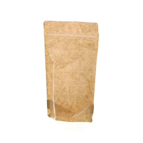 人気のクラフトタイプのチャック付スタンド袋です。表面が透明で中身が見えるタイプです。底マチ付きで自立します。表面はクラフト紙で内側はCP素材で防湿性・機密性に優れ、保存に適しています。 |