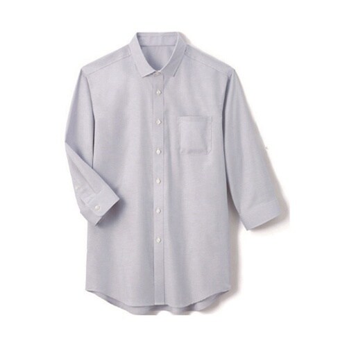 後ろヨーク切替下の両サイドにタック入り。動きやすいオックス素材のシャツです。水仕事など、腕まくりの手間なく作業ができる七分袖。 |