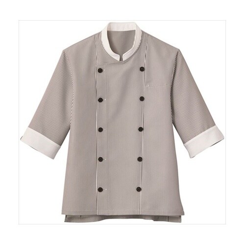 爽やかストライプの衛生対策機能が充実したショップコートです。塩素系漂白剤による退色を防ぐ素材機能から、元の色合いが持続します。水仕事など、腕まくりの手間なく作業ができる七分袖。 |