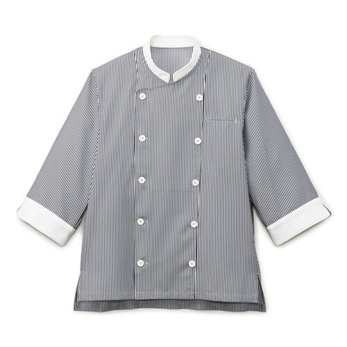 衛生対策機能付き、爽やかなストライプ柄のショップコートです。塩素系漂白剤による退色を防ぐ素材機能から、元の色合いが持続します。水仕事など、腕まくりの手間なく作業ができる七分袖。 |