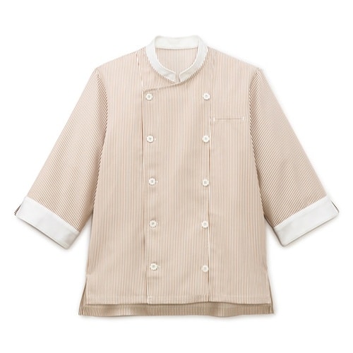 衛生対策機能付き、爽やかなストライプ柄のショップコートです。塩素系漂白剤による退色を防ぐ素材機能から、元の色合いが持続します。水仕事など、腕まくりの手間なく作業ができる七分袖。 |