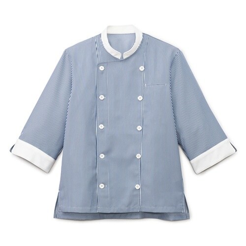 衛生対策機能付き、爽やかなストライプ柄のショップコートです。塩素系漂白剤による退色を防ぐ素材機能から、元の色合いが持続します。水仕事など、腕まくりの手間なく作業ができる七分袖。 |