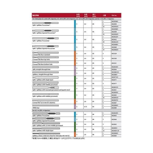 簡単に識別:外観から一目でどのライナーか識別できるように色分けされています。すぐに使用開始可能:パッケージにOリングを含んでいます。信頼性:SGEの標準ライナーは全て不活性処理が施されています。 |