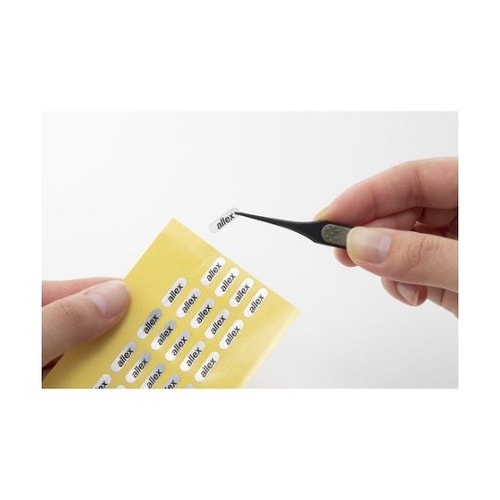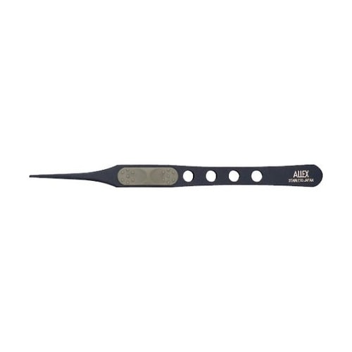 シール等の粘着物が付きにくく剥がしやすいフッ素コーティング仕様です。先端をスキ加工で薄くすることにより、細かい作業に最適です。エラストマーグリップ付で、指先の滑りを防止します。 |