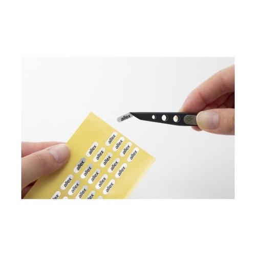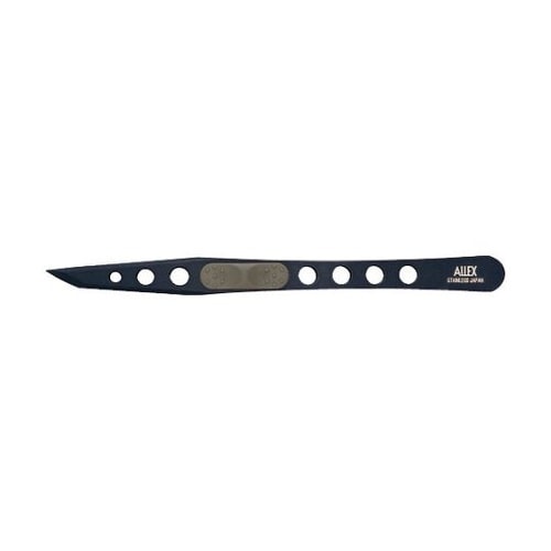 シール等の粘着物が付きにくく剥がしやすいフッ素コーティング仕様です。先端をスキ加工で薄くすることにより、細かい作業に最適です。エラストマーグリップ付で、指先の滑りを防止します。 |