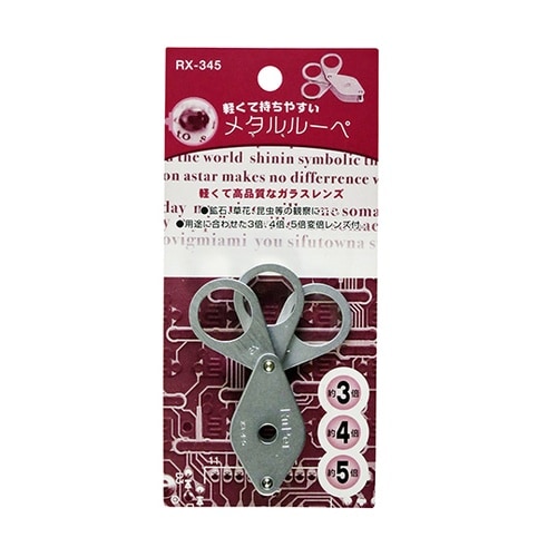 回転収納式の携帯に便利なコンパクト設計なルーペです。鉱石、草花、昆虫等の観察に用途に合わせた3倍、4倍、5倍変倍レンズ付。 |