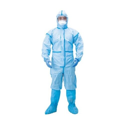 通気性のあるSFS生地を用いる事により、ハイレベルなバリア性能を誇る最高性能のツナギ服です。耐水度は2200mm以上です。SFS生地でできたツナギ服です。 |