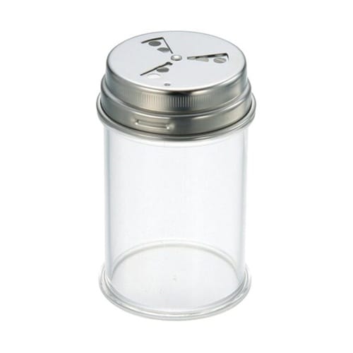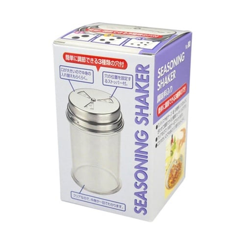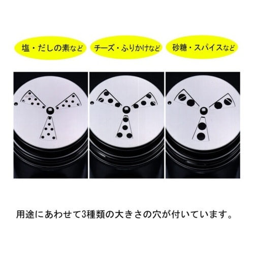 スパイスや粉チーズ・塩・砂糖等入れるものに合わせて調節できる3種類(大・中・小)の穴が付いています。本体はクリアなので中身が一目でわかります。口が大きいので中身の入れ替えもらくらく行えます。 |
