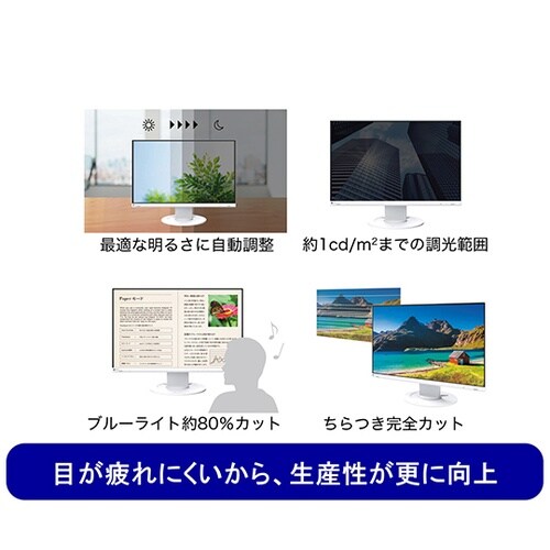 周囲の明るさを感知し、画面の明るさを自動で調整します。ブルーライトカット機能が付いており、目の負担を減らします。 |