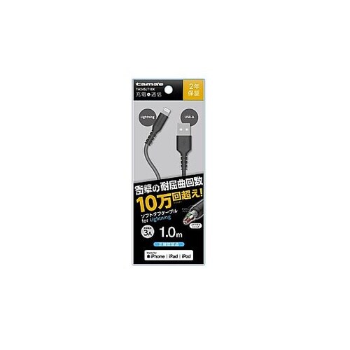iPhone/iPod/iPadなどの充電とデータ転送に対応。コネクタの根元を強化、スパイラルシールド採用でやわらかく断線に強い。 |