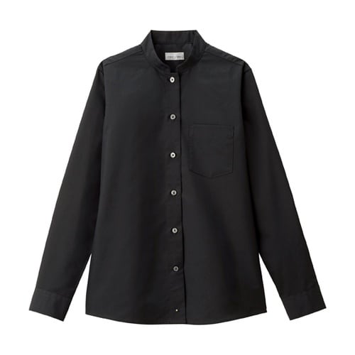 幅広いシーンで活躍する、定番ブロード生地のレディススタンドカラー長袖ブラウス。左胸アウトポケット付き。