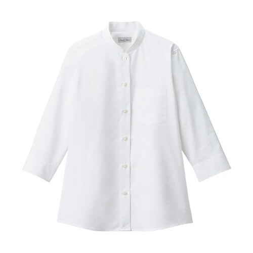 幅広いシーンで活躍する、定番ブロード生地のレディススタンドカラー七分袖ブラウス。左胸アウトポケット付き。